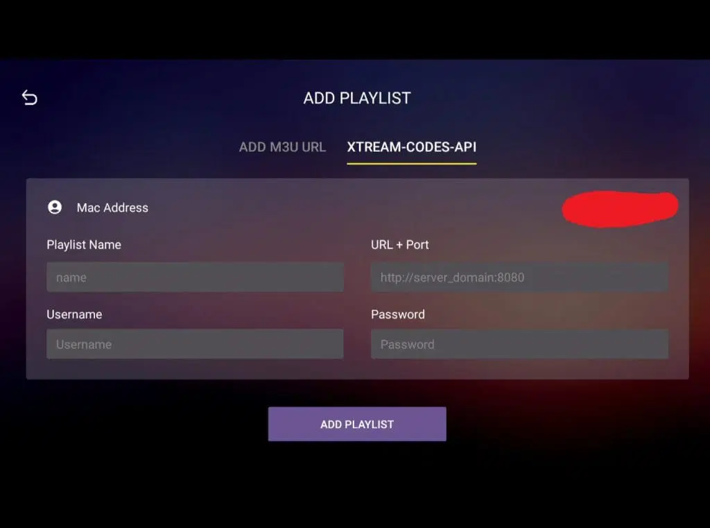 Välj “XTREAM-CODES-API” och fyll i dina inloggningsuppgifter som du fått via e-post. I rutan “Playlist Name” skriver du “svenskiptv.com”. Dubbelkolla stavningen och tryck sedan på “ADD PLAYLIST”.