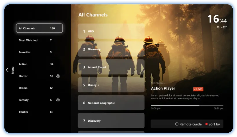 Gränssnittet är enkelt att navigera, vilket gör att även nya användare snabbt kommer igång. Fjärrkontrollen innehåller dessutom praktiska snabbknappar för snabb åtkomst till appar och favoritkanaler.